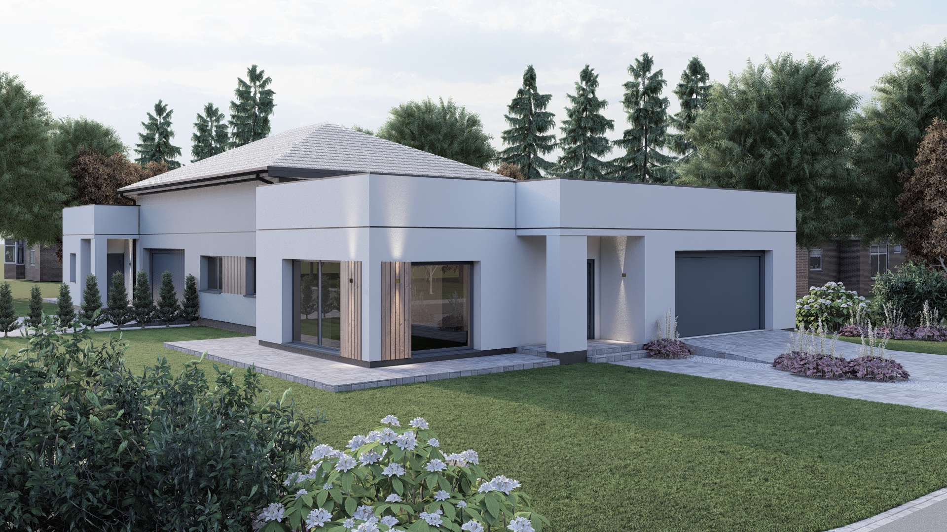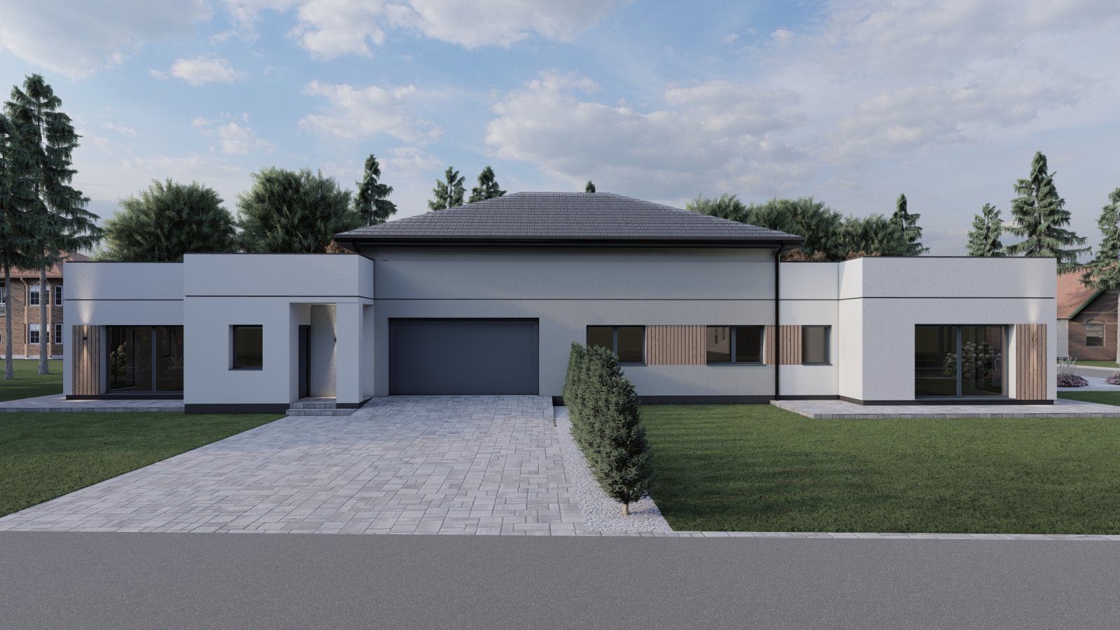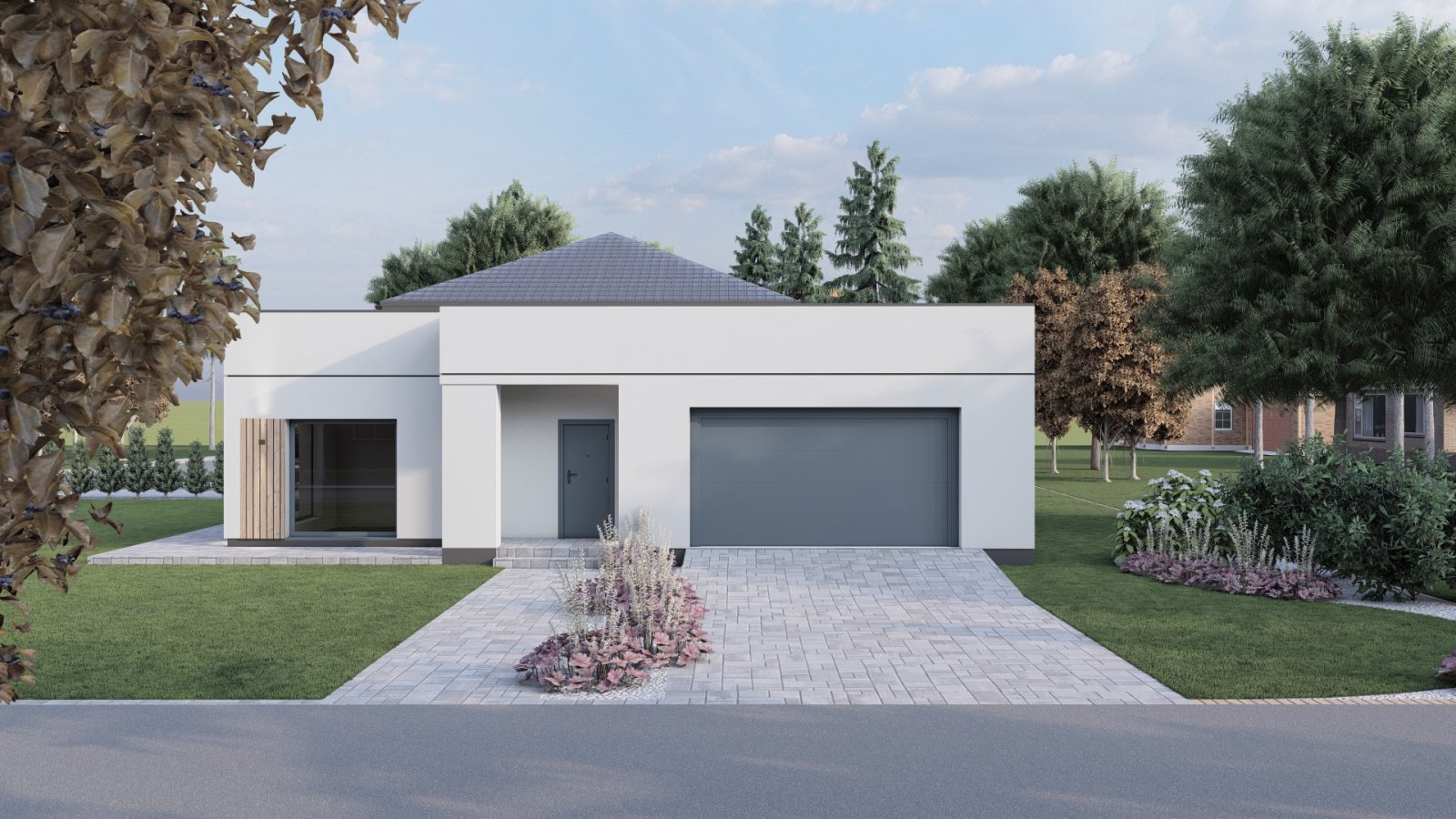 Architektura obu etapów jest spójna: nowoczesna, stonowana, bez zbędnych fajerwerków. To te domy, które dobrze wyglądają nie tylko na wizualizacji, ale i po latach, bo opierają się na prostych liniach, neutralnych kolorach i czytelnej formie.