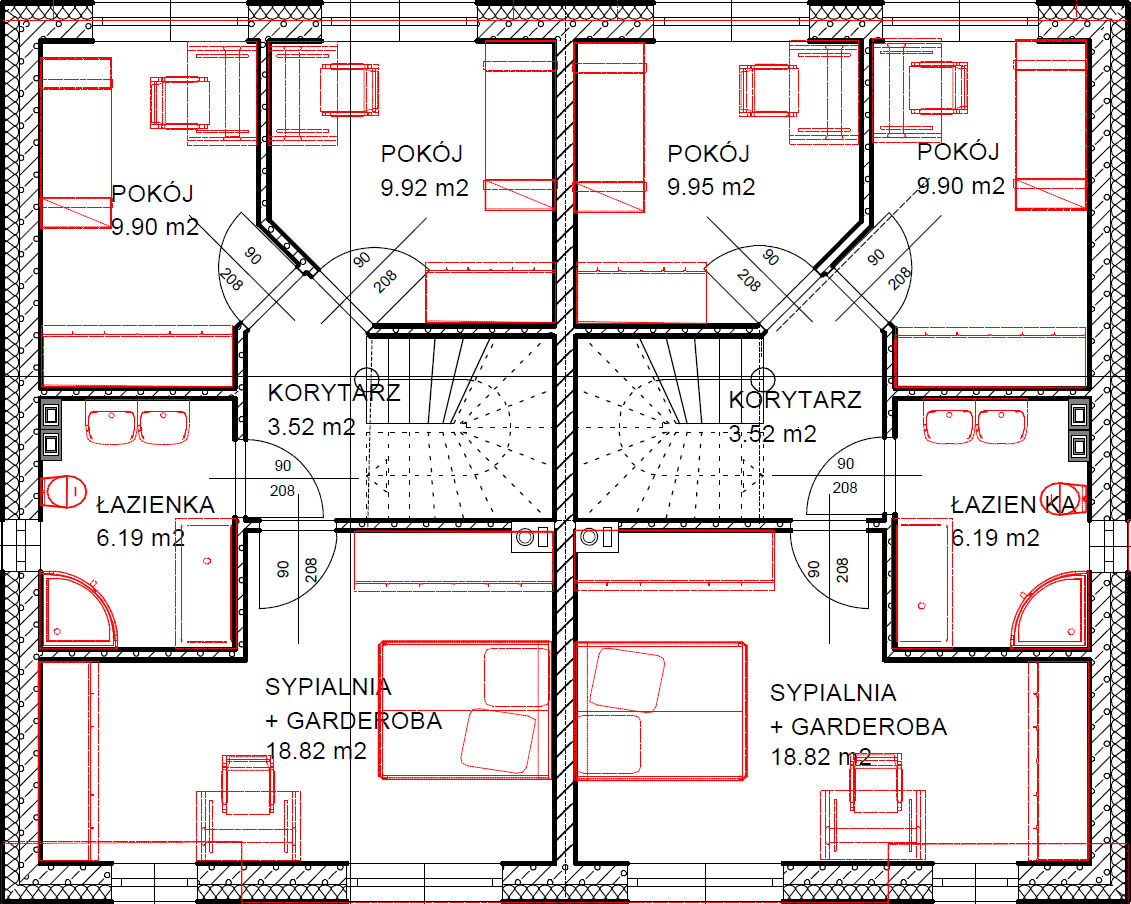 Domy nie posiadają garażu, co pozwoliło wygospodarować dodatkowe pomieszczenia na parterze przydatne na gabinet do pracy zdalnej.