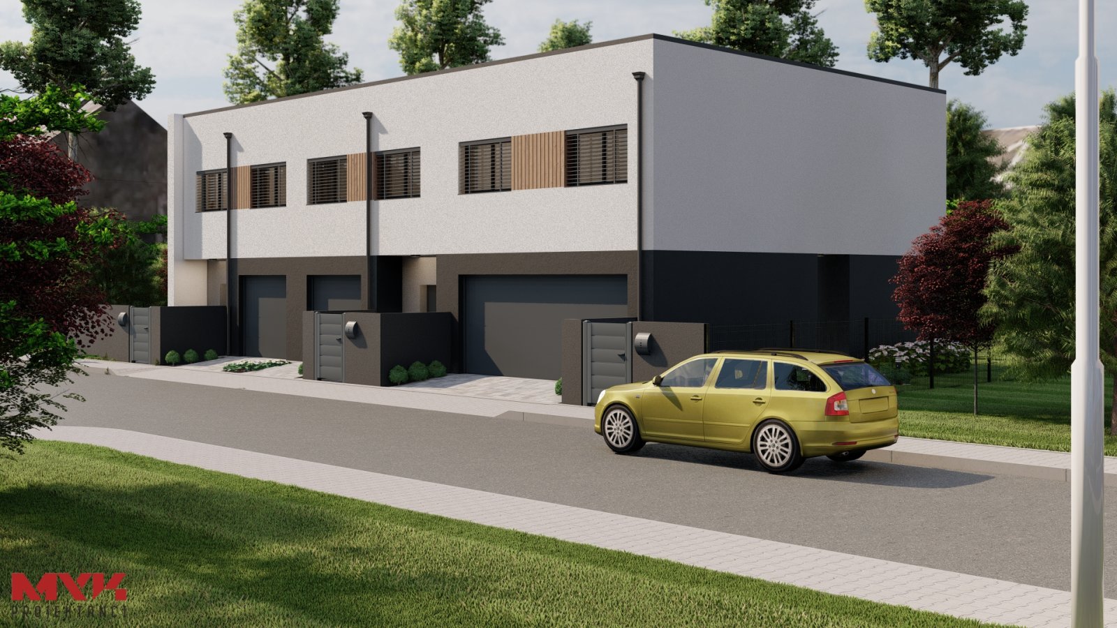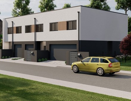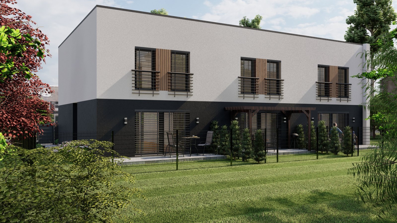 Trzy domy w zabudowie szeregowej w nowoczesnej willi mieszkaniowej. W parterze zlokalizowaliśmy przestrzeń dzienną z salonem, garażem, toaletą i pomieszczeniem gospodarczym. Na piętrach zmieściliśmy cztery sypialnie i łazienkę.