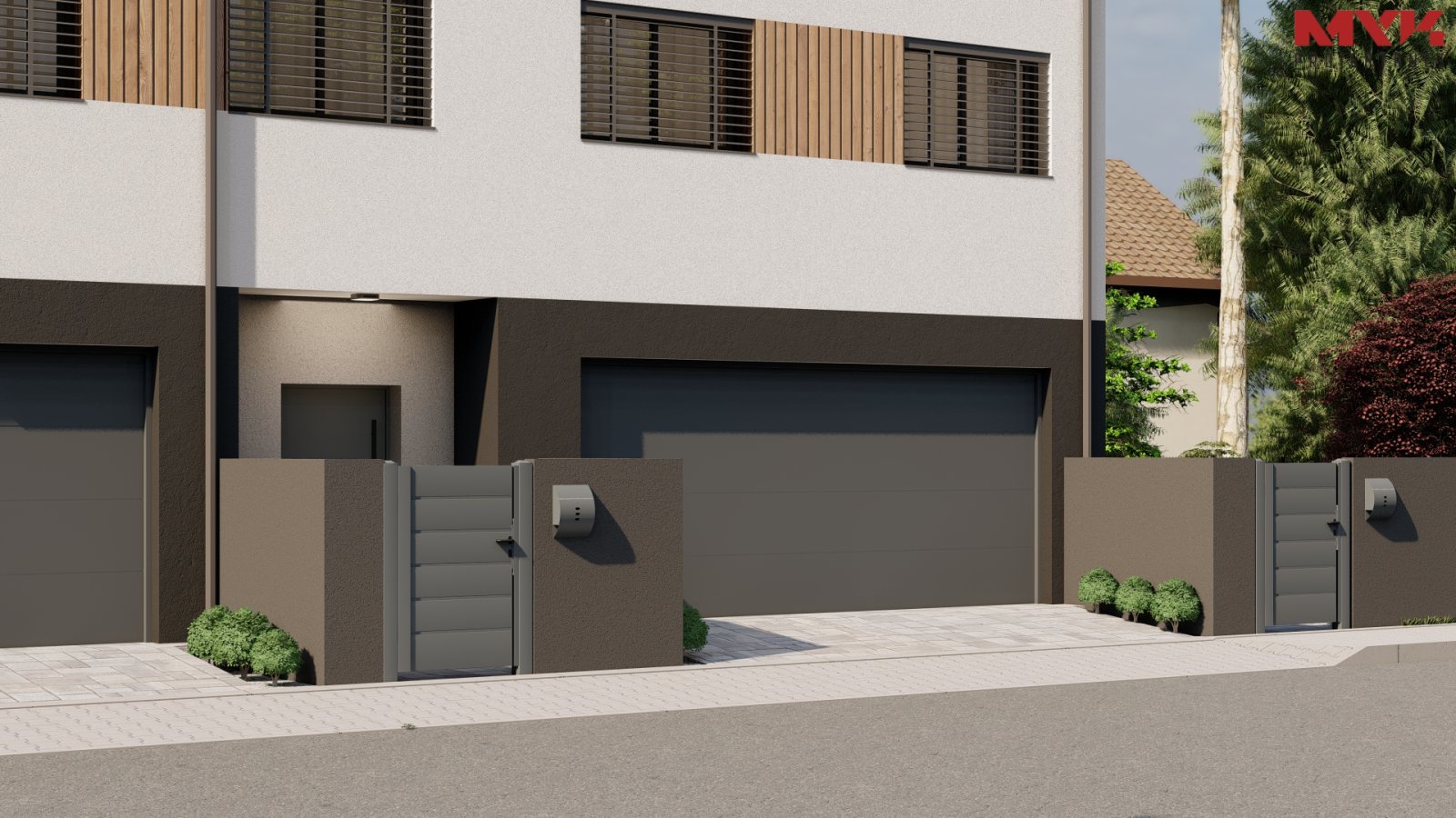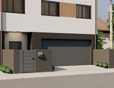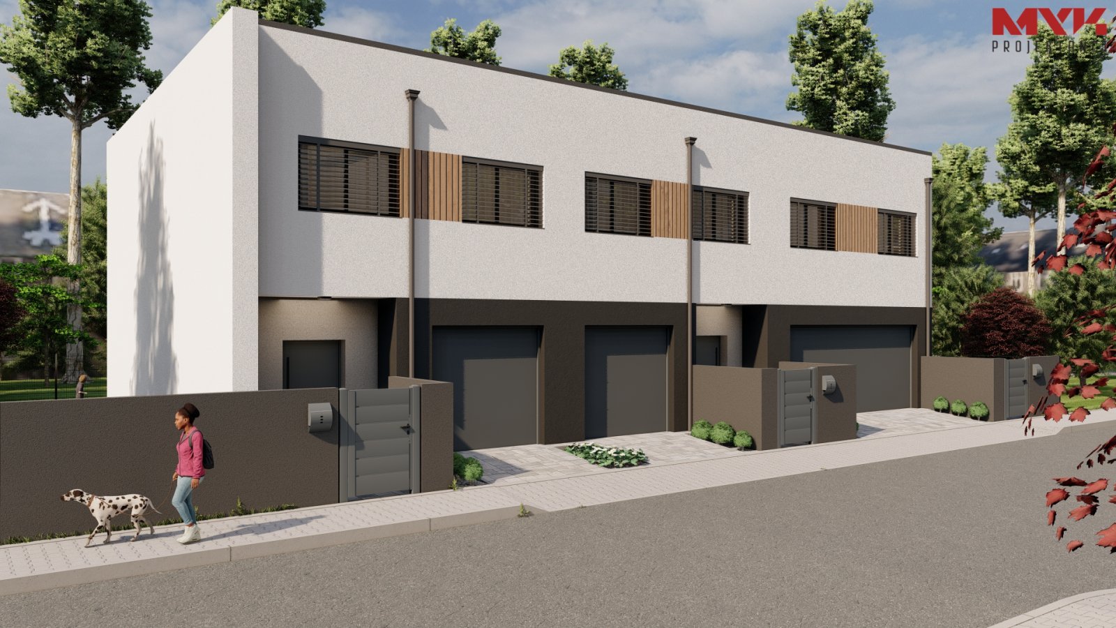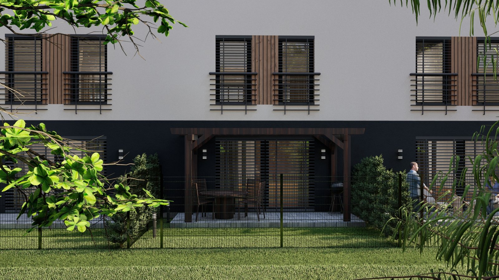 Trzy domy w zabudowie szeregowej w nowoczesnej willi mieszkaniowej. W parterze zlokalizowaliśmy przestrzeń dzienną z salonem, garażem, toaletą i pomieszczeniem gospodarczym. Na piętrach zmieściliśmy cztery sypialnie i łazienkę.